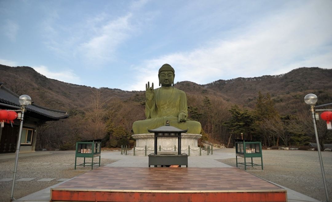 현재 이곳에는 대웅전(大雄殿), 설법전, 관음전(觀音殿) 등의 건물이 들어서 있다. 높이 12m, 둘레 30m, 무게 60t에 이르는 거대한 청동아미타불상과, 엄청난 규모의 태양의 성종이 특히 유명하다. 또한 1996년 10월 15일에 낙성된 대웅전은 목조 건물로는 국내 최대 규모이다.